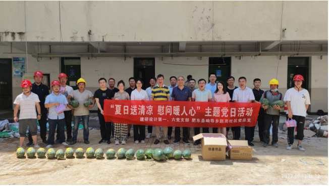 夏日炎炎、酷暑盛行。7月12日上午,公司第一、六黨支部組織黨員前往公司合肥師范學(xué)院錦繡校區學(xué)生公寓維修工程EPC項目現場(chǎng),開(kāi)展了“夏日送清涼 慰問(wèn)暖人心”主題黨日活動(dòng),為駐守項目的一線(xiàn)職工和參建工人送去防暑降溫慰問(wèn)品。