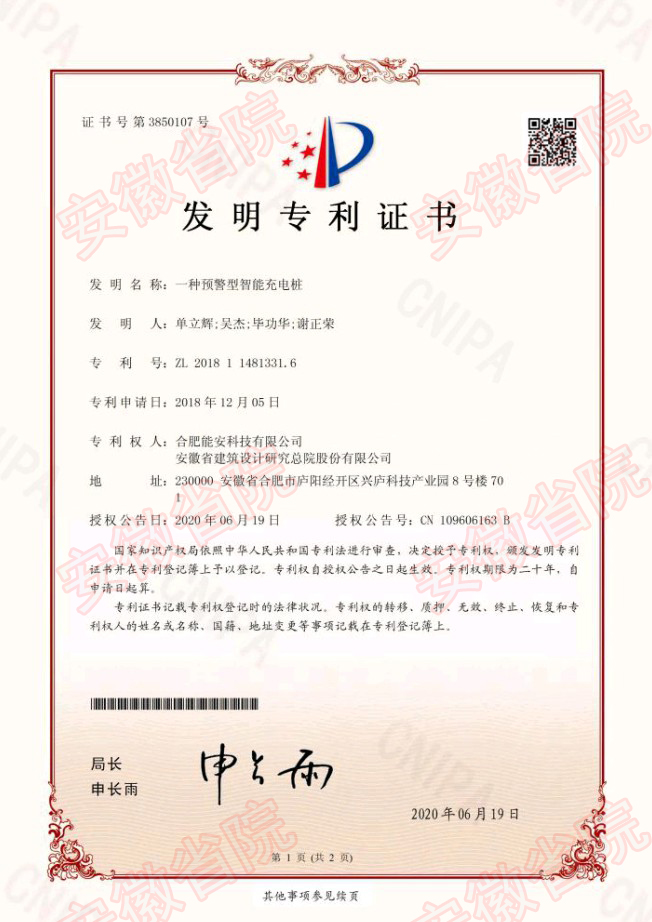2020年6月19日,公司和合肥能安科技有限公司合作申報的“一種預警型智能充電樁”喜獲國家知識產(chǎn)權局的發(fā)明專(zhuān)利授權,這是公司首次獲得發(fā)明專(zhuān)利。
