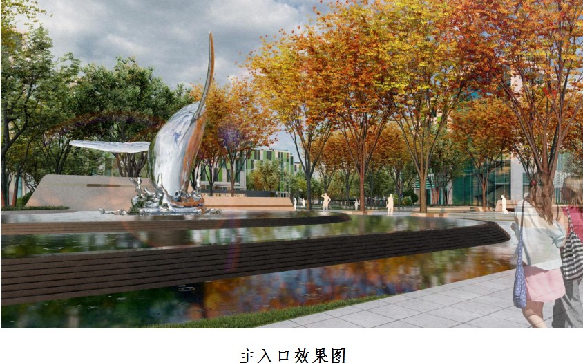 在入口展示區,延續一、二期景觀(guān)風(fēng)格,以“生命之源”為主題,結合兩側城市綠帶,呈翼動(dòng)之勢,舒展的形態(tài),好似雙臂一張擁抱人群,寓意展翅騰飛。