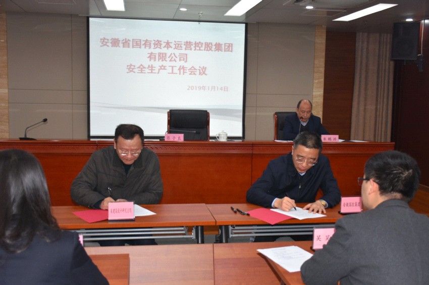 1月14日上午,安徽國控集團召開(kāi)安全生產(chǎn)會(huì )議,傳達全國及全省安全生產(chǎn)電視電話(huà)會(huì )議精神,總結集團2018年安全生產(chǎn)工作,部署2019年重點(diǎn)工作安排。會(huì )上,我公司總經(jīng)理、安委會(huì )主任徐正安代表公司與安徽國控集團簽訂了安全生產(chǎn)責任書(shū)。