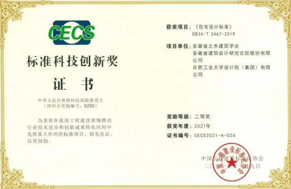 近日,中國工程建設標準化協(xié)會(huì )在山東濟南舉辦了“標準科技創(chuàng )新獎”的頒獎儀式,由公司聯(lián)合安徽省土木建筑學(xué)會(huì )、合肥工業(yè)大學(xué)設計院主編的安徽省地方標準《住宅設計標準》(DB34/T 3467-2019)(簡(jiǎn)稱(chēng)“標準”)在眾多申報項目中脫穎而出,榮獲“標準科技創(chuàng )新獎”項目獎二等獎。