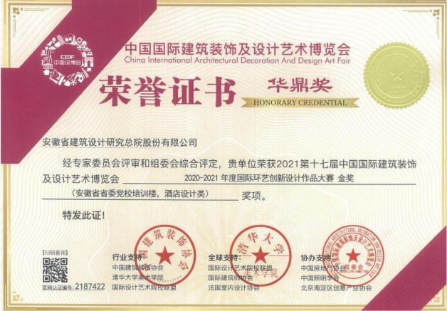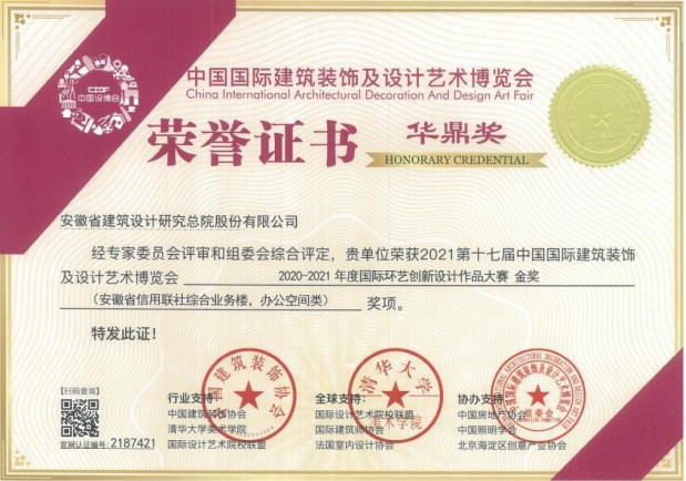 近日,公司建筑裝飾設計院在2021第十七屆中國國際建筑裝飾及設計藝術(shù)博覽會(huì )(華鼎獎)國際環(huán)藝創(chuàng )新設計作品大賽中,榮獲“2020-2021年度國際環(huán)藝創(chuàng )新設計作品大賽”酒店設計類(lèi)金獎(安徽省省委黨校培訓樓項目)、辦公空間類(lèi)金獎(安徽省信用聯(lián)社綜合業(yè)務(wù)樓項目)兩項榮譽(yù)。