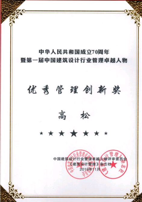 高松董事長(cháng)在“中國建筑設計行業(yè)管理卓越人物”評選中 榮獲“優(yōu)秀管理創(chuàng )新獎”