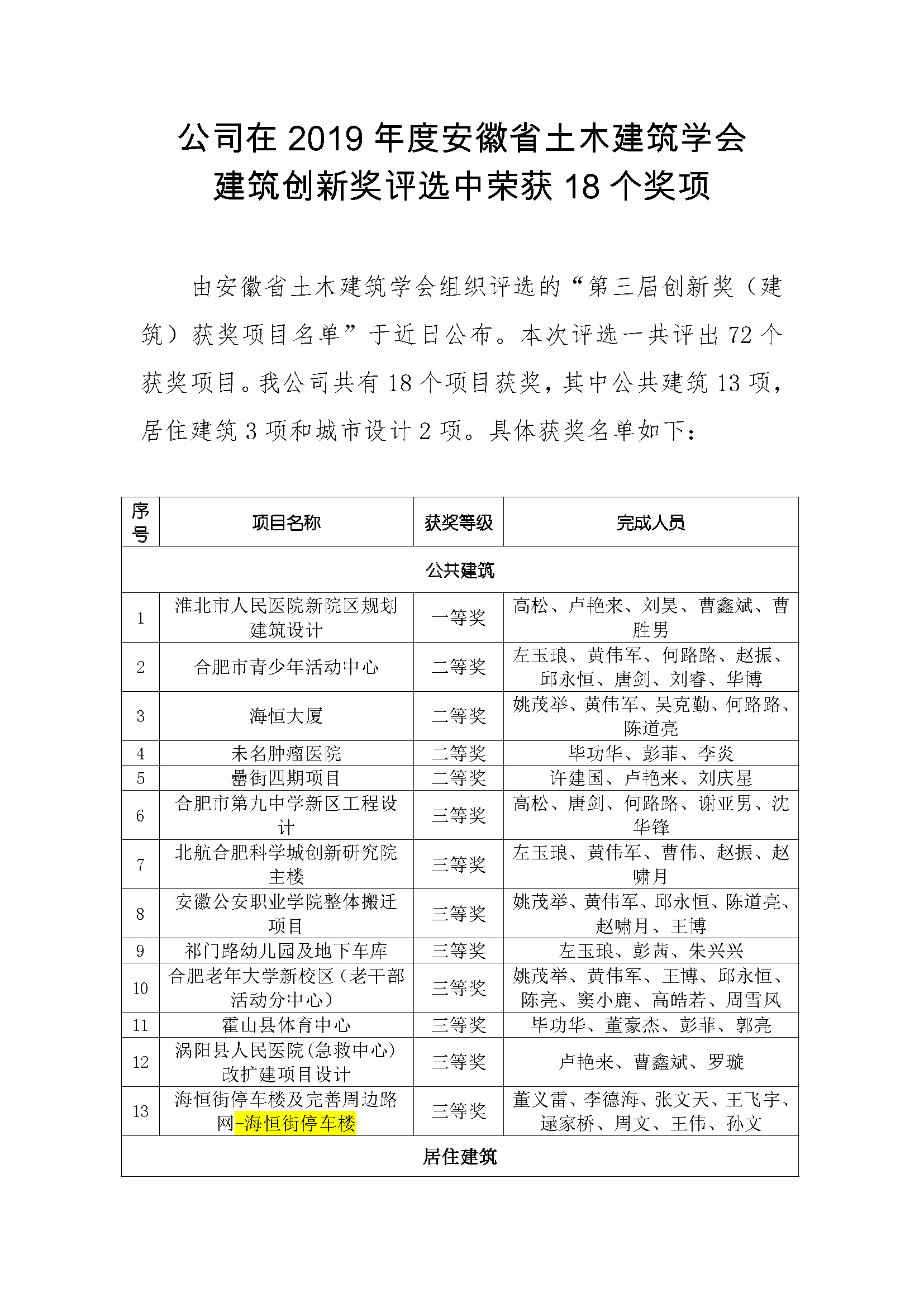 公司在2019年度安徽省土木建筑學(xué)會(huì )建筑創(chuàng )新獎評選中榮獲18個(gè)獎項