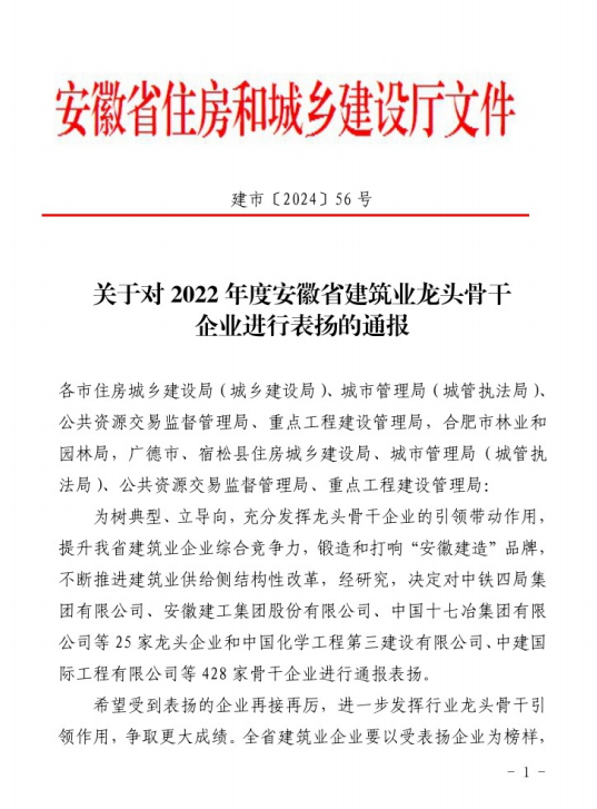 公司獲“2022年度安徽省建筑業(yè)骨干企業(yè)” 稱(chēng)號